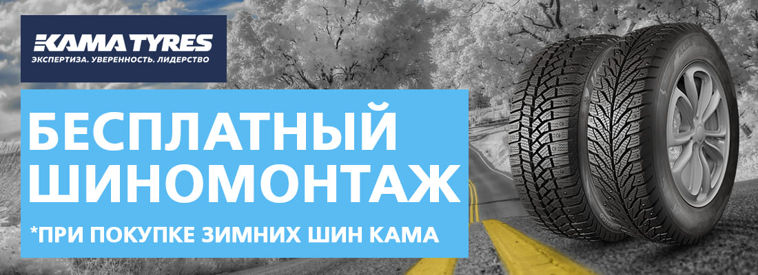 - При покупке комплекта (от 4-х) зимних шин «KAMA TYRES» одного типоразмера, предоставляется - ШИНОМОНТАЖ БЕСПЛАТНО (услуга бесплатного шиномонтажа также распространяется на VIATTI).
